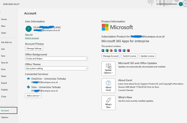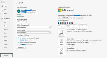 Buka salah satu file EXCEL kamu buka File buka akun dan di sini kamu bisa log in dengan akun dan pasword ecampus kamu cukup mudah bukan skr kamu memiliki semua akses terhadap akun kamu di microsoft office berlisensi resmi